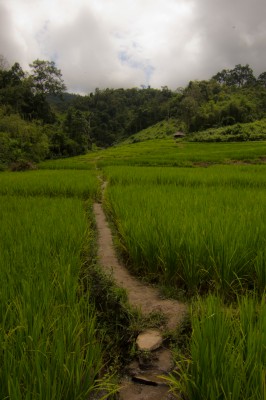 The path followed the rapids for another 20-30 minutes but still there was no proper waterfall in sight. Just a couple of water buffaloes. Tom was eager to go for a swim though and thus we kept walking. After a while the jungle cleared and we saw a couple of huts surrounded by rice paddies.
