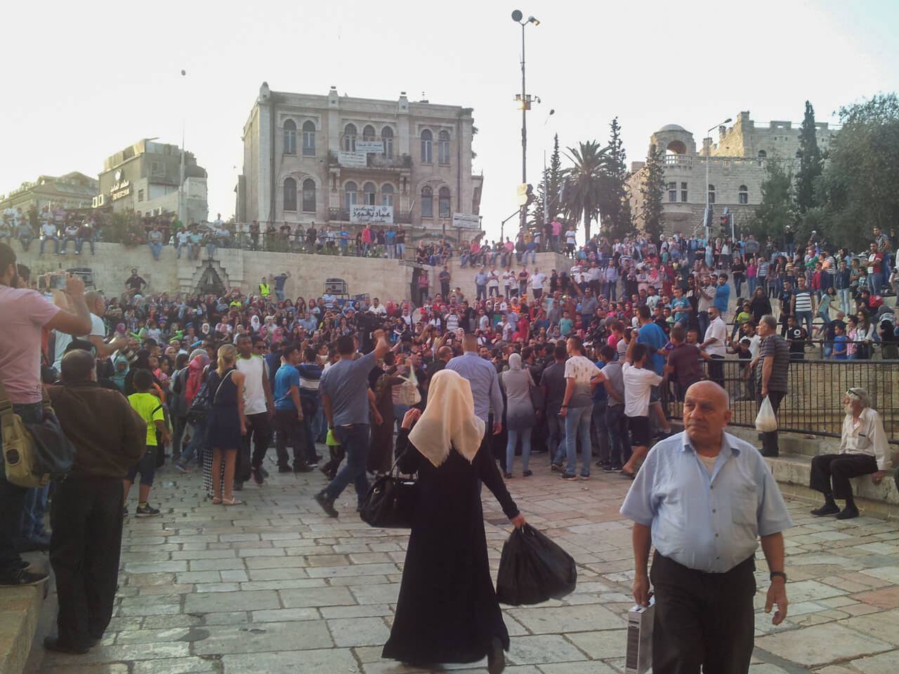 Not even a minute later, Israeli police (or soldiers, can’t tell the difference) are in the middle of it. The crowd starts shouting “Allāhu Akbar” and I retreat back into the inner walls of the old city.
