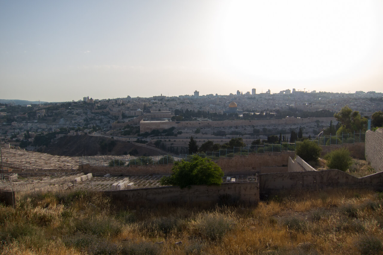 Mount of Olives is the go-to destination for that and hostel staff recommended to take a Palestinian bus up there. Those leave from the Arab bus station that serves East Jerusalem and the West Bank.
