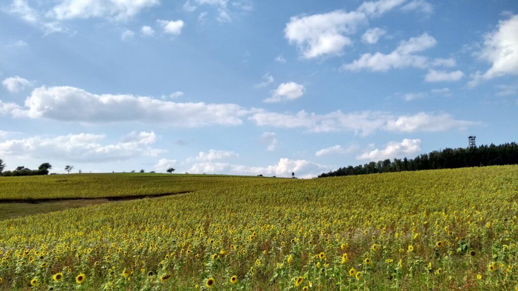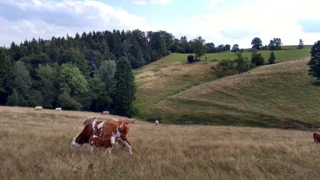At some point we crossed back over the river (on a proper bridge this time) and left the forest in the late afternoon. The last bit of the hike led us through an agricultural area with cattle and sunflower fields.