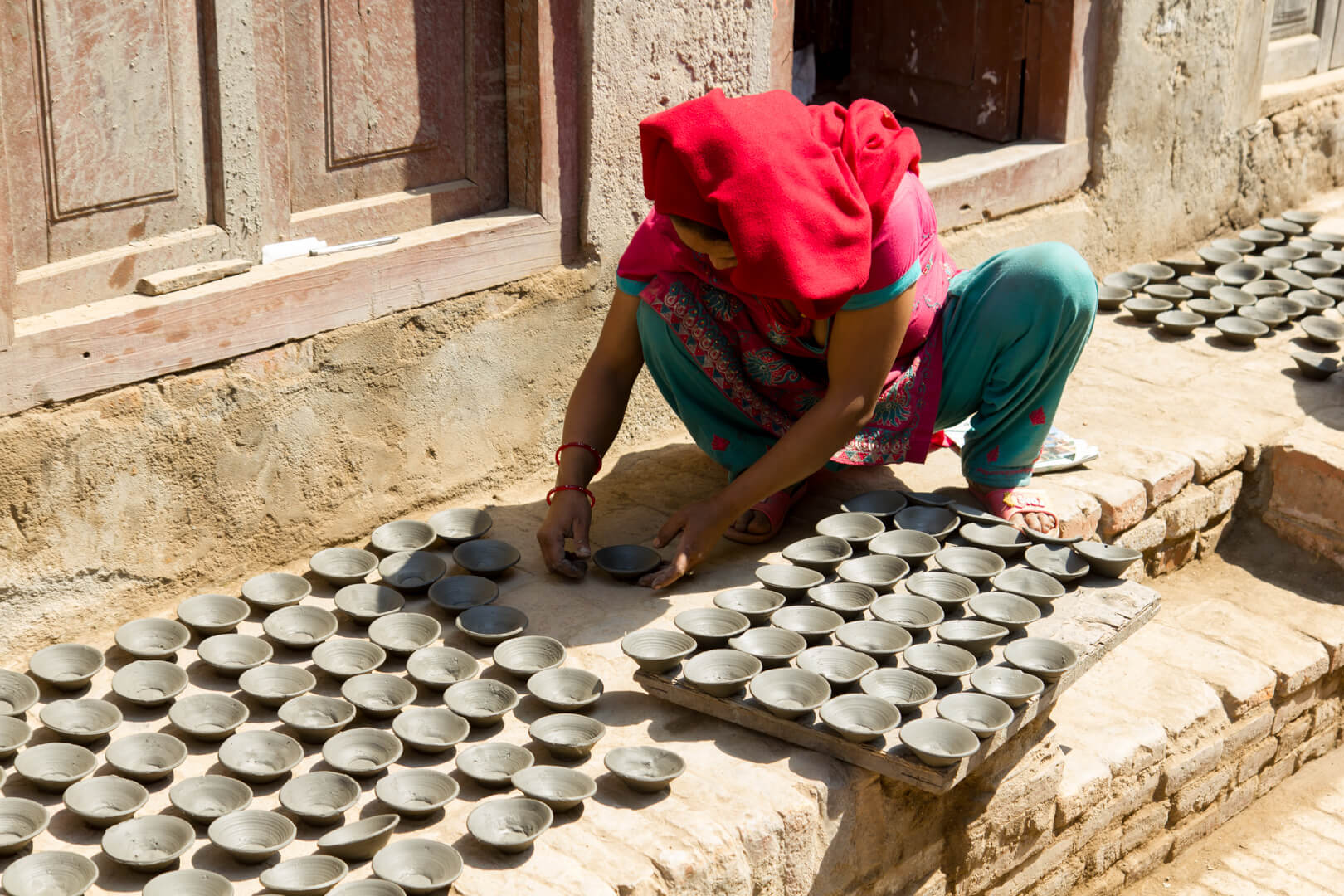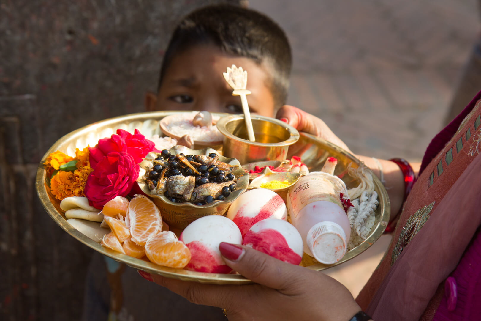 People in this area are fairly religious and bring a lot of offerings to the temples. Right after the gods have received them, the offerings are considered fair game for the needy. Kids snatch what they can get.