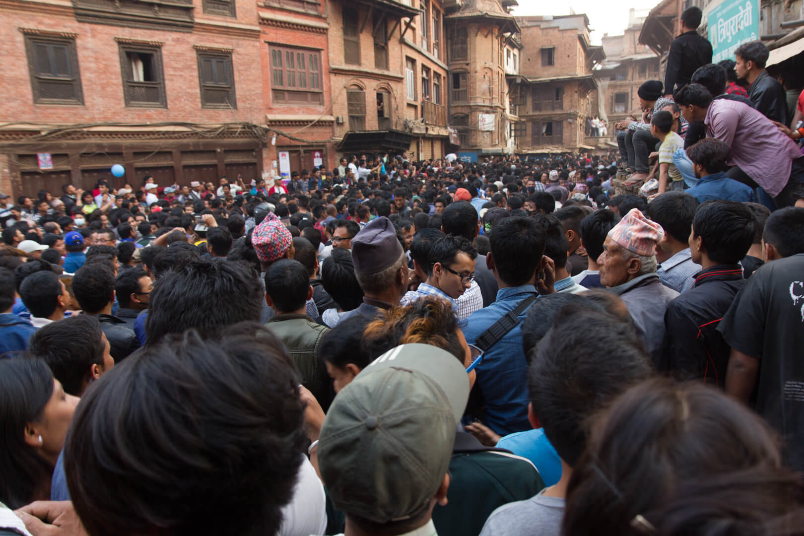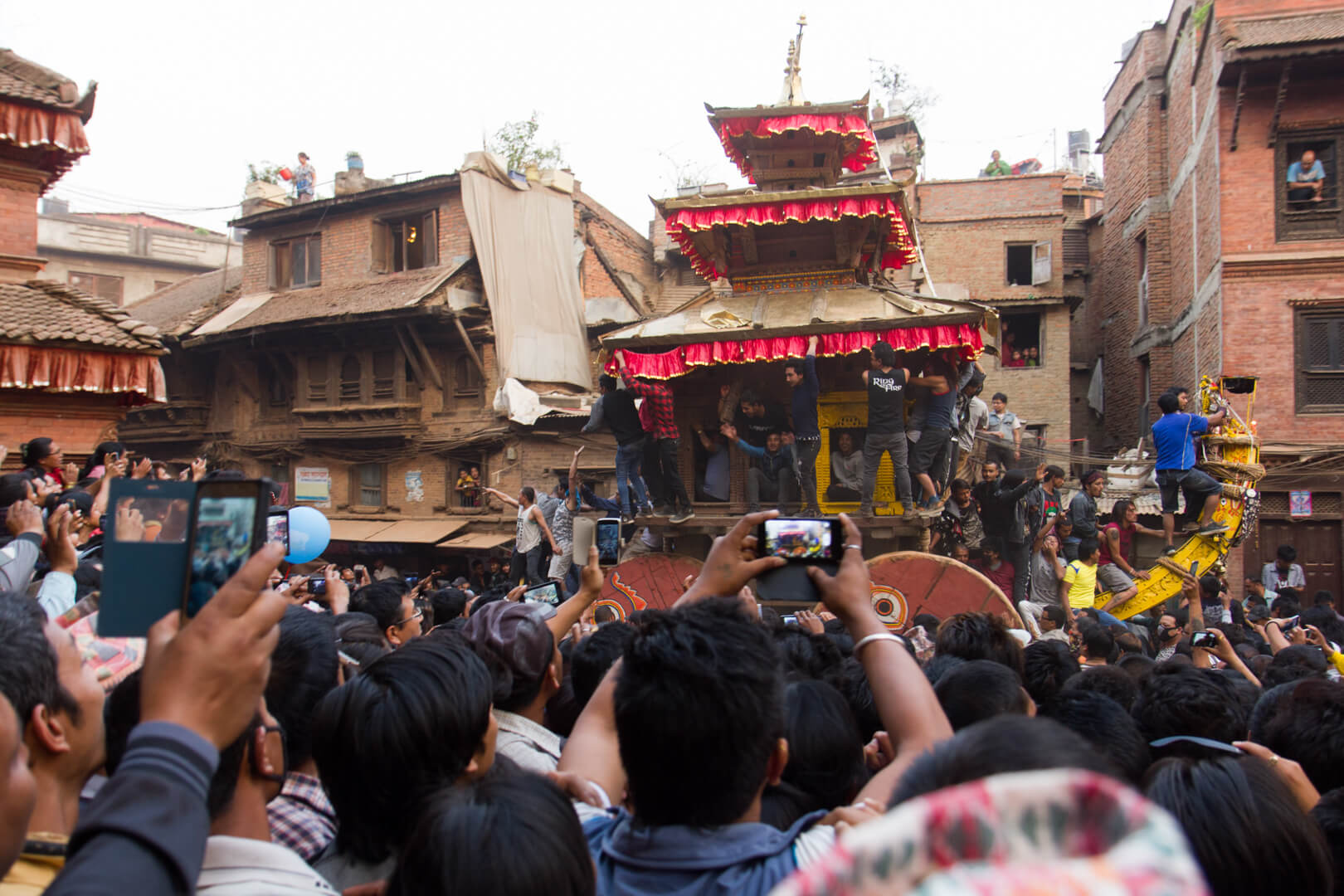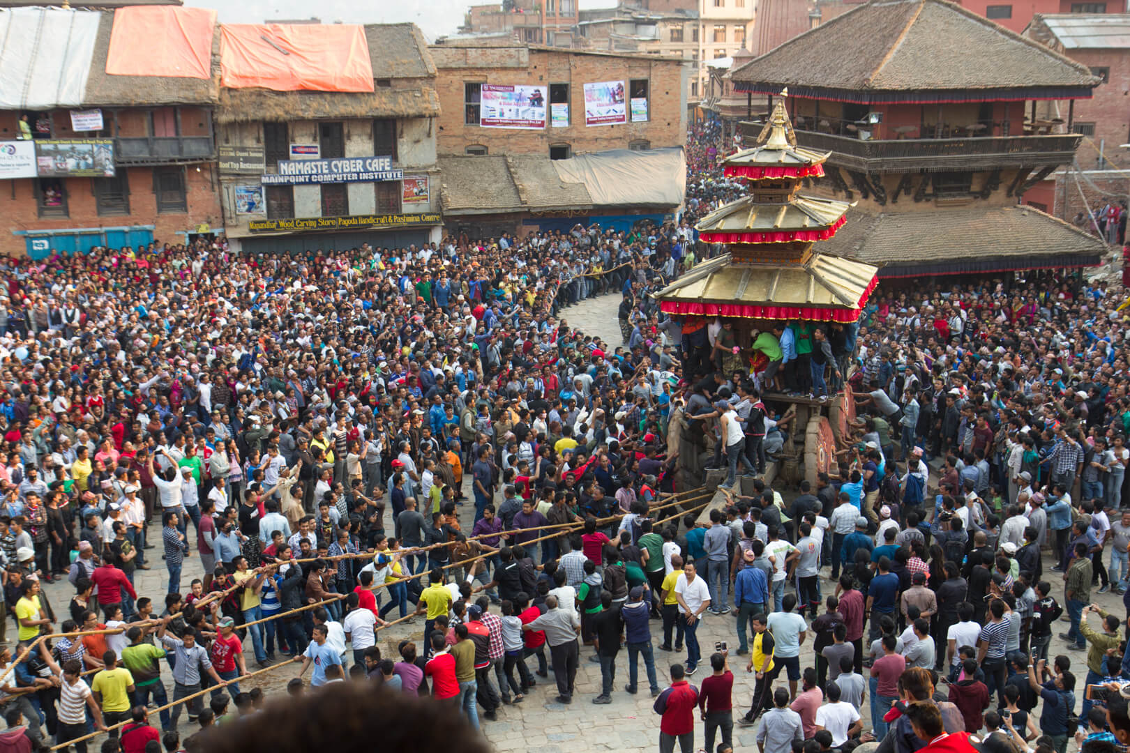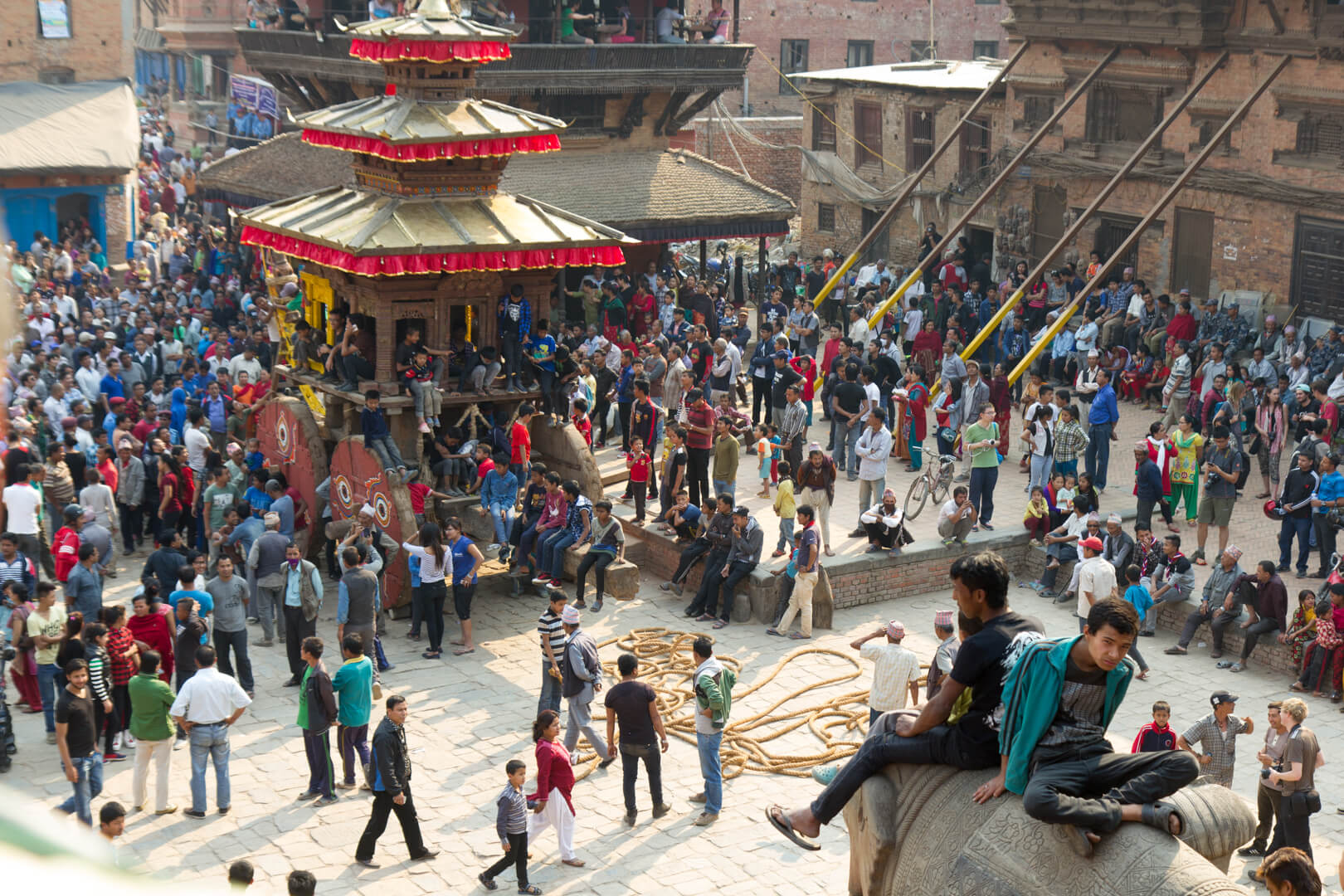 In the afternoon, the afore mentioned New Year’s celebrations started. The opening act is the pulling of a chariot through the streets of the city. I had climbed a temple near where the preparations were going on and had a great view over the event. Bit of a stadium atmosphere up there