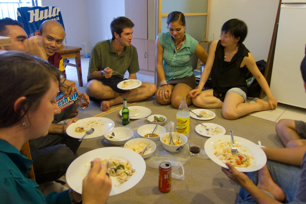 Yesterday some friends and couchsurfers came over for Thai food. I was a bit overwhelmed by the response to my invitation and in the end it was eleven of us who needed to be fed from two hot plates. Good thing that Thai food can be cooked quickly, once all the preparations are done. As I don’t have a massive dinner table, we had the food Thai-style: on the floor.