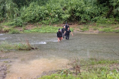On the other side we headed straight into the jungle, following a path the villagers use for their travels. As it had been raining for a while, the path was muddy and slippery. Walking there required undivided attention. After half an hour we reached a stream that we had to cross on foot.