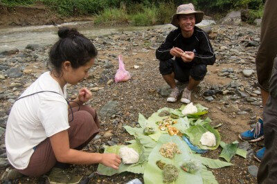 Around noon we reached a clearing near the stream and stopped for lunch. Our guides had brought the food along and set up the table on a couple of leaves. No plates and cutlery here so everybody wash their hands please.