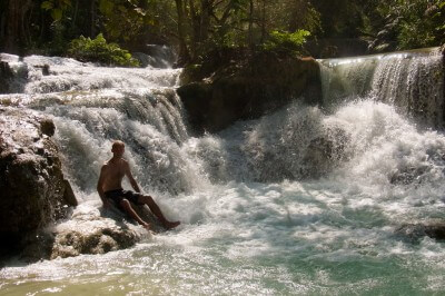 One of the main attractions around Luang Prabang is the Kwang Si waterfall, about 45 minutes out of town. We joined forces with a couple of other travellers from the guest house to get a transport out there. The tuk-tuks here are a bit bigger and fit eight people quite comfortably. As much as sitting on benches in the back of a truck can be called comfortable.