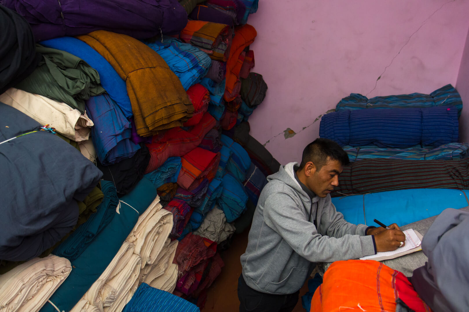 Nandu Dai in his fabric store, 20km (sic!) of fabric in that room[/caption]