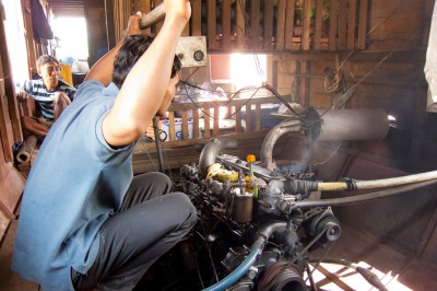 When sitting around got too boring, I went to have a look around. In the back of the room is the ’engine room’ and it looks as dodgy as the rest of the boat. They put some holy flower equipment on top of it, just to make sure. One of the guys also put some bananas and rice on it, not sure if that was for the gods or for his warm lunch.
