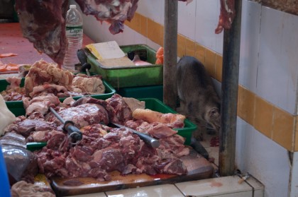 The wet markets are usually divided into sections. Just next to the (big) fish section were the butchers and as it happens all so often, hygiene standards were a little below those of the western world.