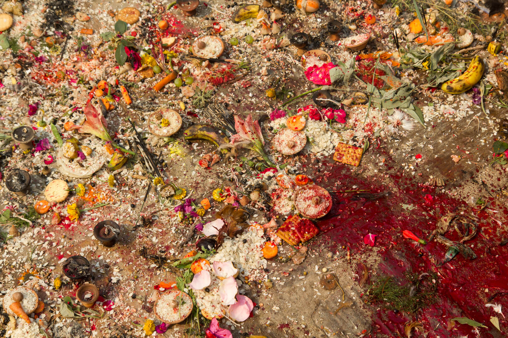 Some of the chicken were killed in the spots surrounding the chariot and the ground there was filled with rice, fruit, blood, flowers, chicken heads, wicks and whatelse.