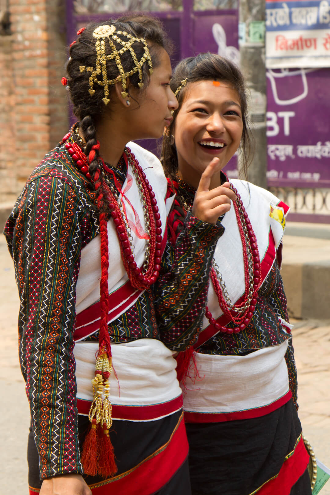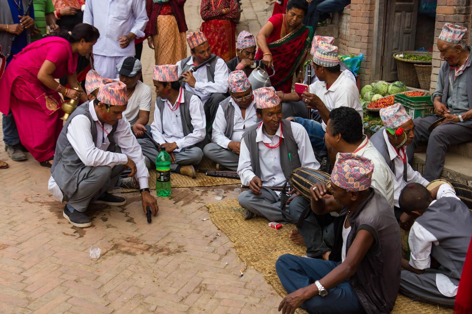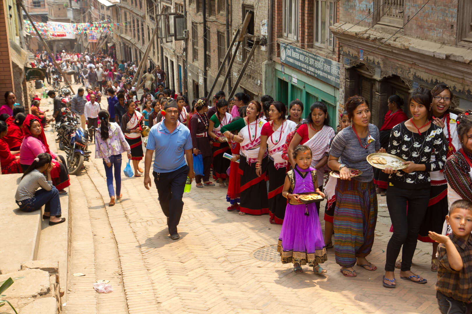 In comparison to huge chariots, even bigger poles and pools of chicken blood, today was almost mundane. Devotees of the various gods and goddesses walked through the streets, visiting their favourite temples. Many of them were wearing traditional Newari dresses and most groups had a couple of musicians as well.