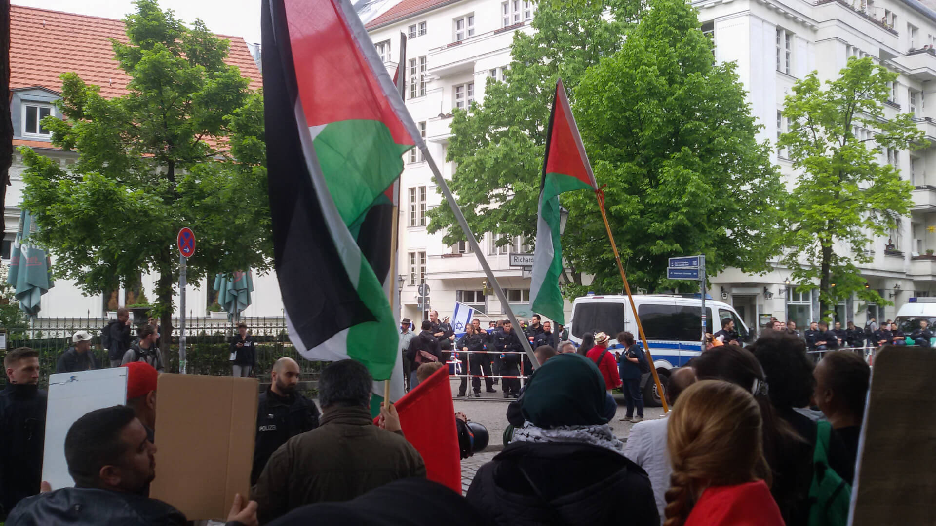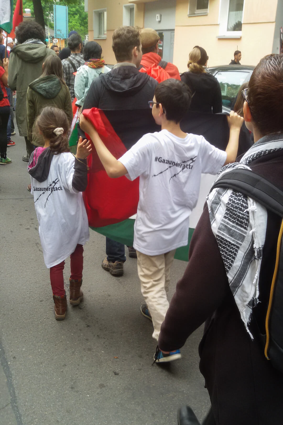 The whole rally counted something like 300-400 participants (plus as many police) from all kinds of backgrounds. German leftists demanded a socialist and equal state in the Middle East, “Jews for Palestinian Right of Return” showed that not everybody who speaks Hebrew hates Arabs, and local refugees proclaimed “From the River to the Sea, Palestine Will Be Free”.