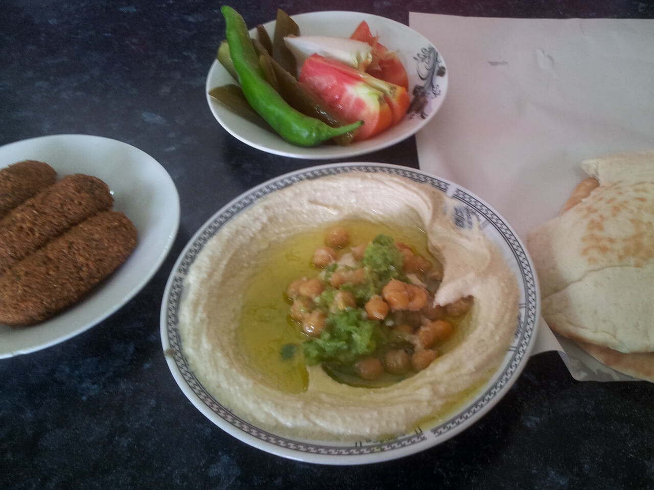 My Breakfast - Hummus, Pita, etc.[/caption]