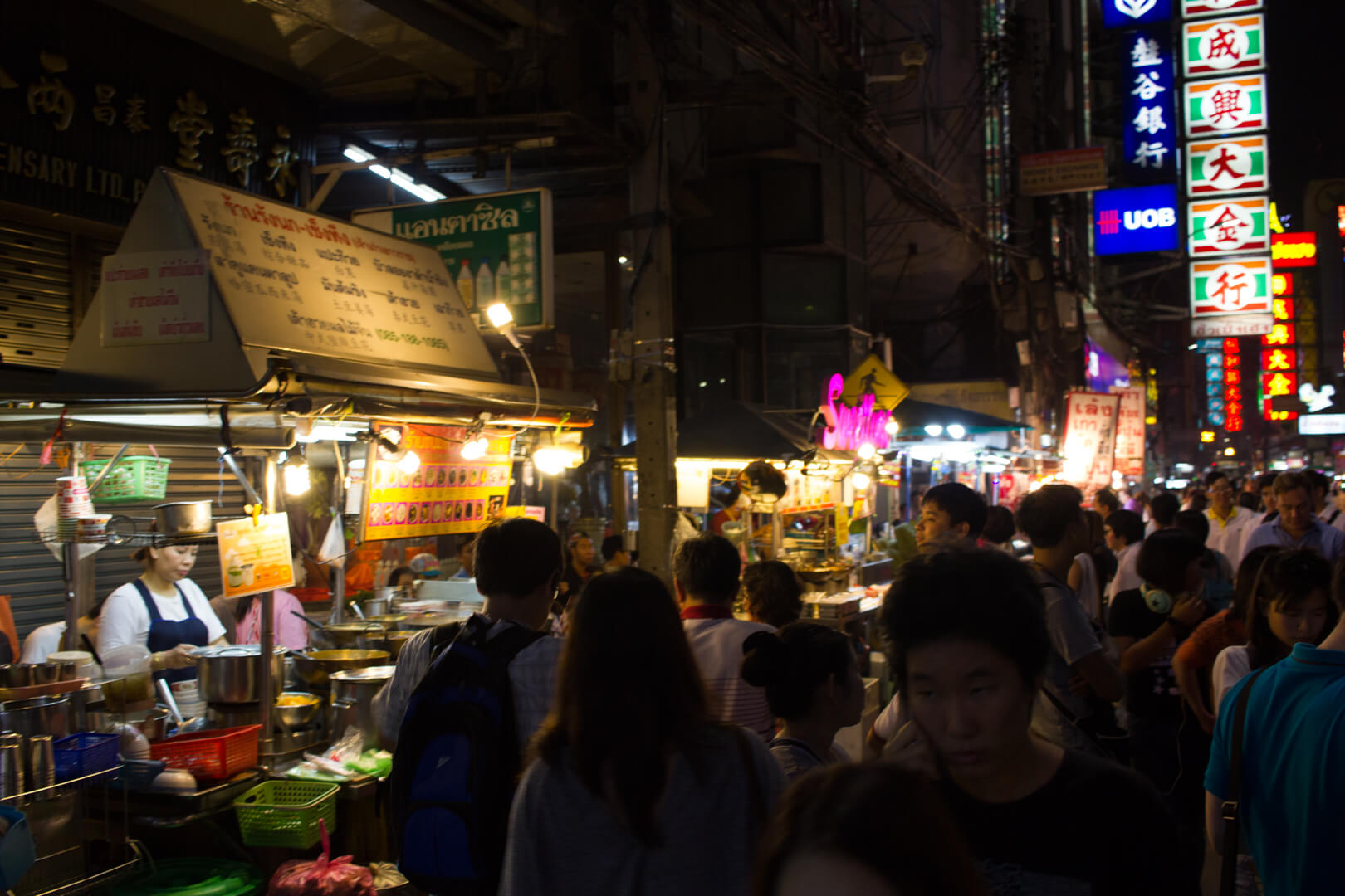 On Saturday evening my destination was Bangkok’s Chinatown where couchsurfer Goi took me for some local food. The main road of the district is incredibly busy and every single building is decorated with countless neon signs.