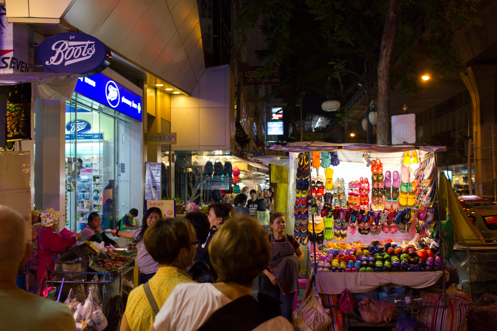 During the day, Silom is a business district with office workers filling the streets. At night it’s still a business district but the industries have changed. One of the sois is home to the infamous Pat Pong sex tourist haven and the whole main road is lined with small shops selling… pretty much everything. Souvenir t-shirts, fake Rolex, dildos, knuckle-dusters, hand-carved soap, …