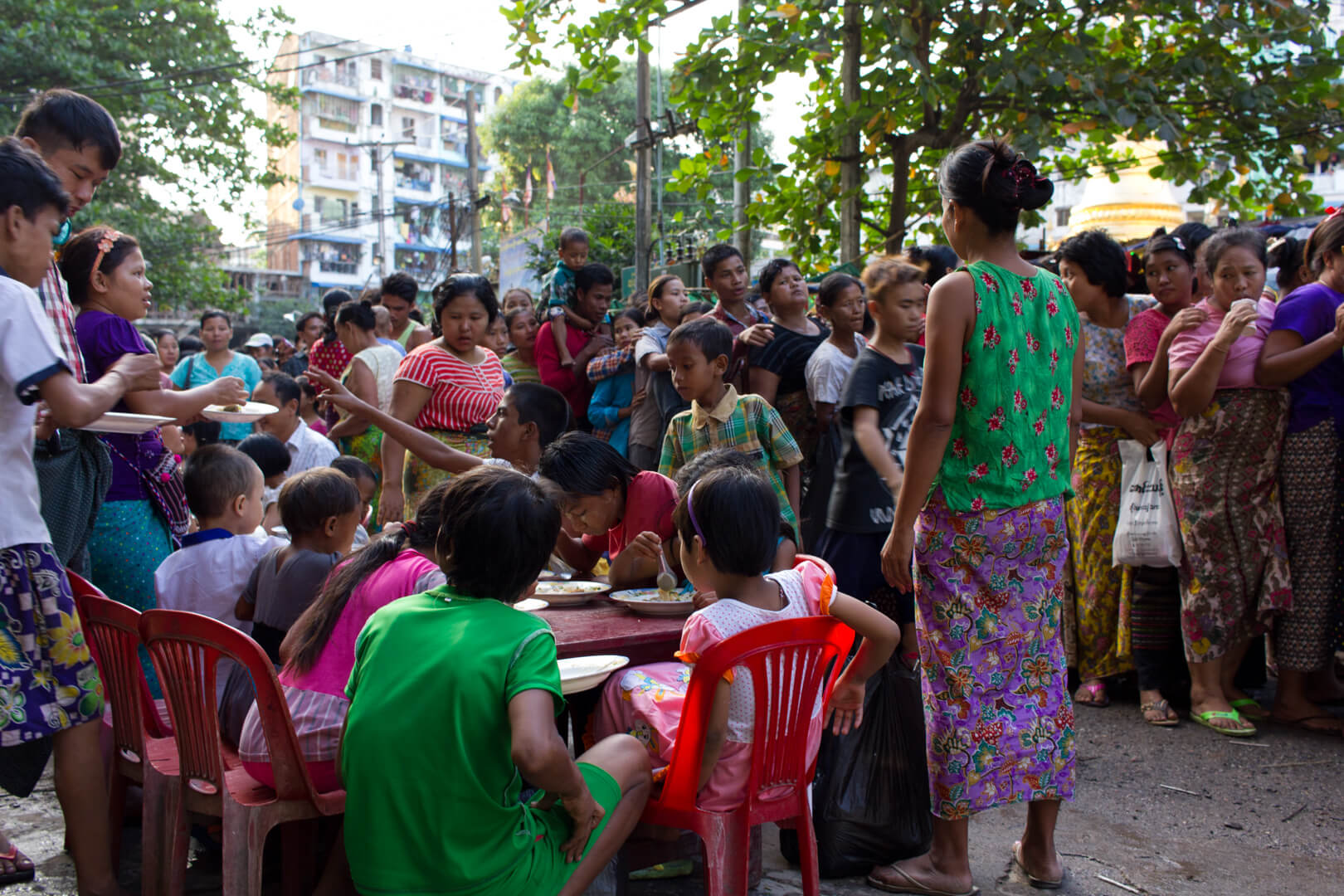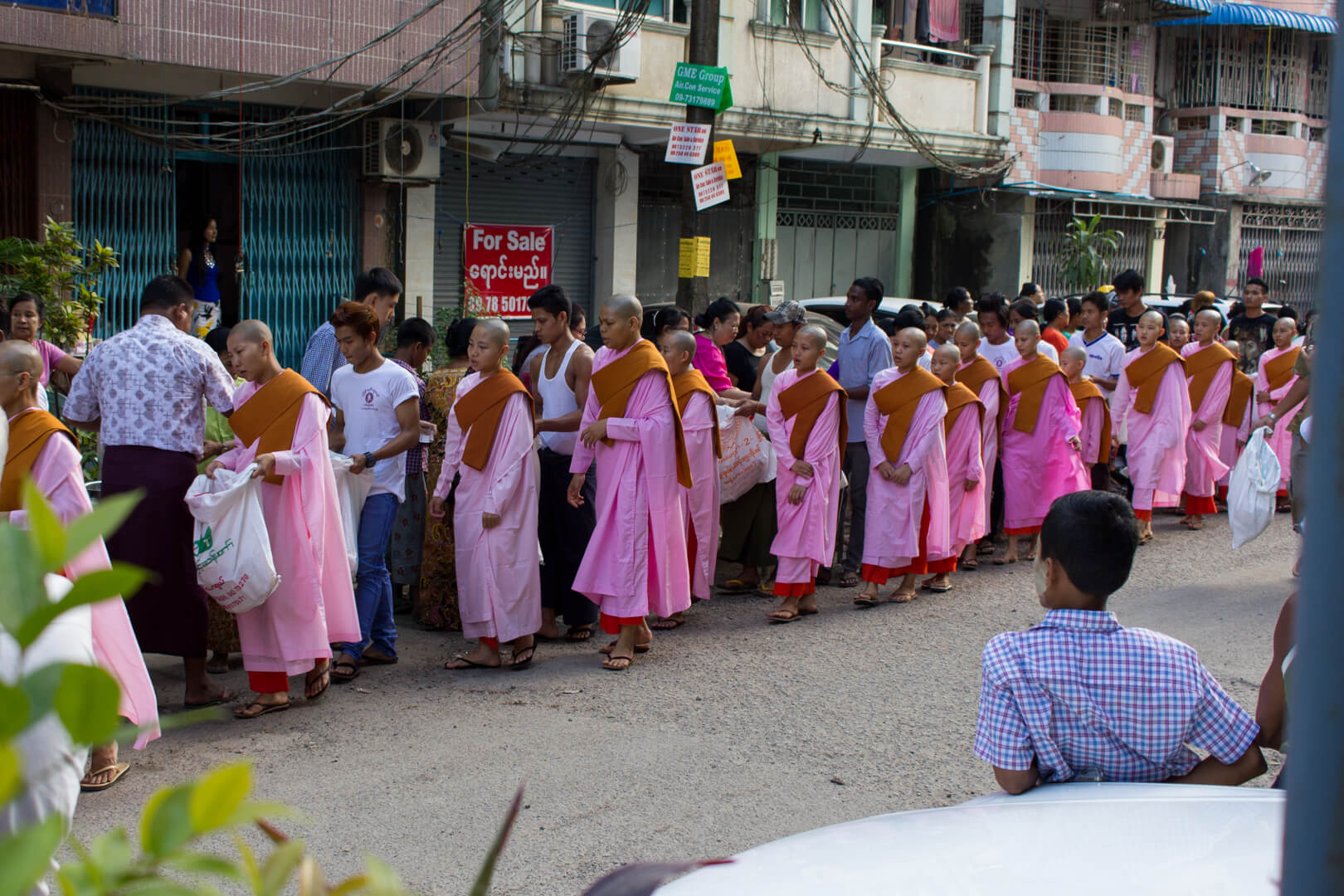 It took place in the street right in front of the hostel and was a little wild at times. Everything was calm and orderly while the monks (or nuns in this case) received their alms. However once donations and food were open to the general public, push came to shove.