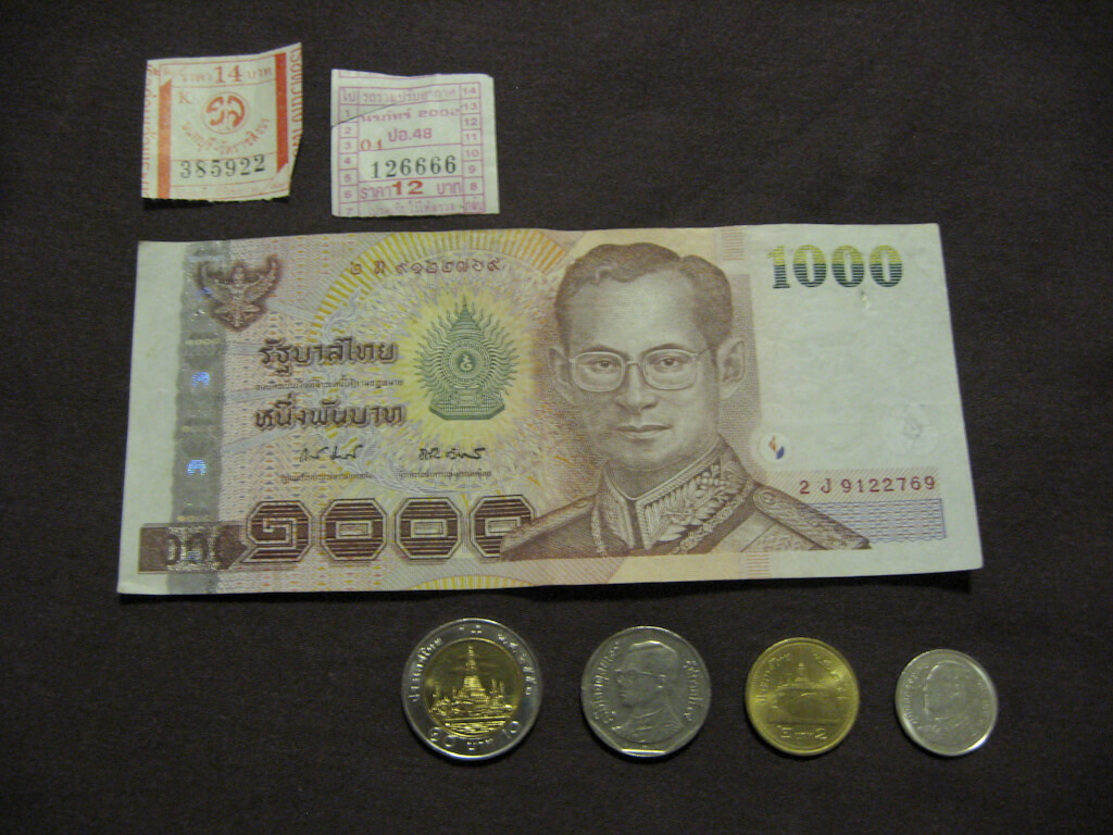 From the top left: ferry ticket, bus ticket, 1000 Bath note, coins 10, 5, 2, 1. The 10 Bath coin looks very familiar, have to try if European vending machines accept it.
