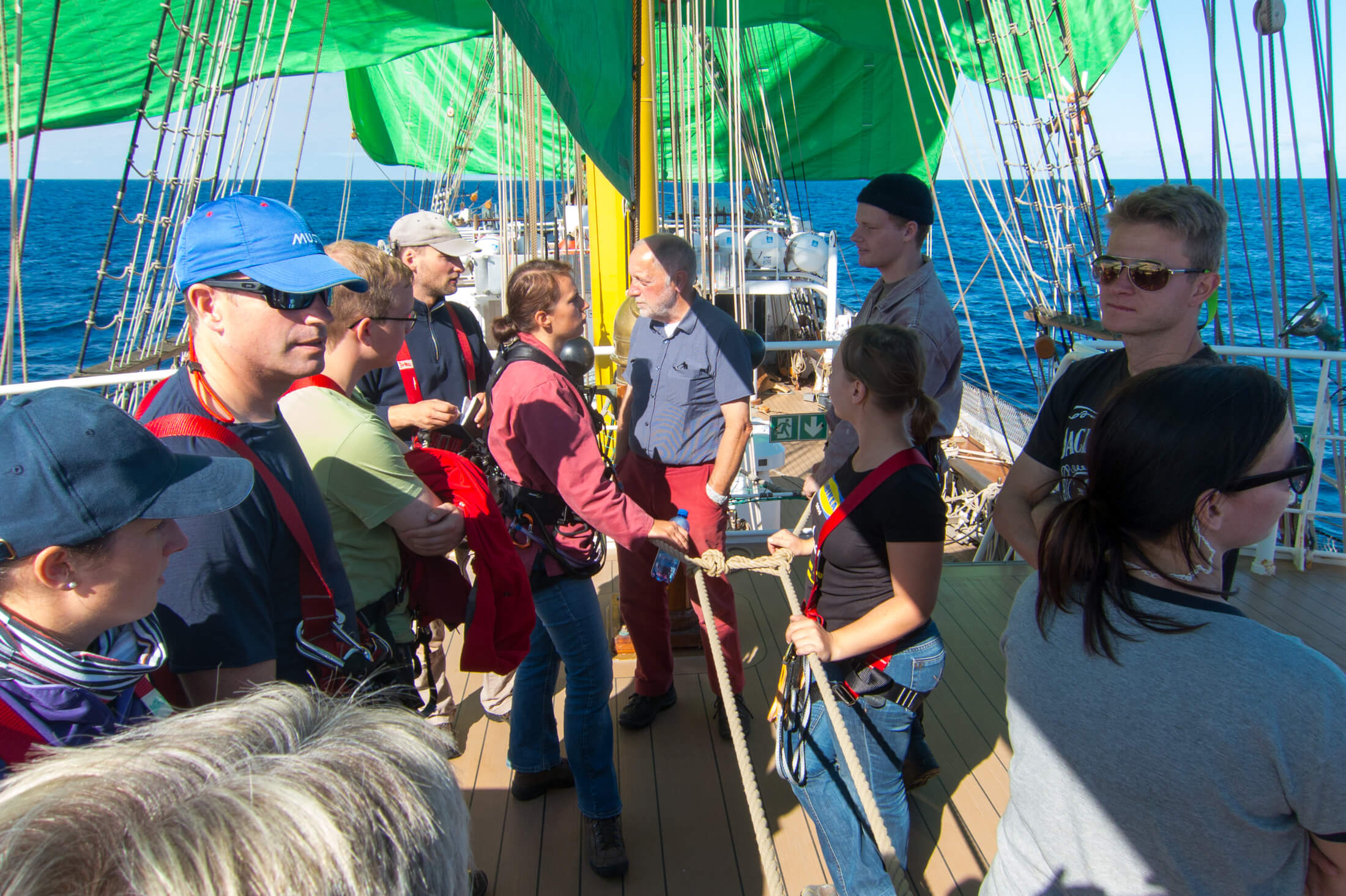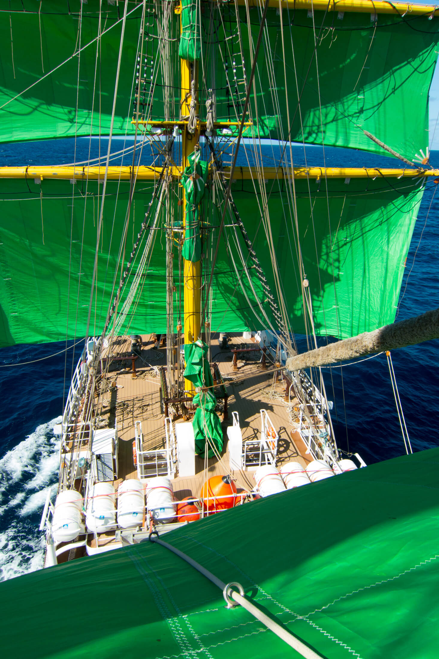 Today we have the sea to ourselves and during first rudder I don’t have much to do. The ship is still running on engine but we have set a fair bit of sail and set a couple more in the next hours. Nothing’s too busy and there’s time for a scenic view from above.