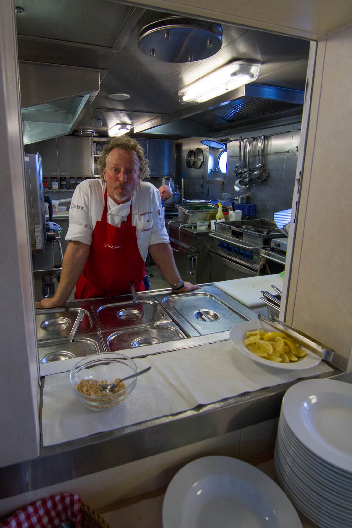 At 11:00 I’m back in the mess to prepare for lunch. Our star chefs crank it up a notch for the captain’s birthday and serve steamed Cod on potatoes and spinach in mustard sauce. These guys have developed a devote following within the first days and from what I’ve been told they are the top end of chefs the galley of this ship has ever seen.