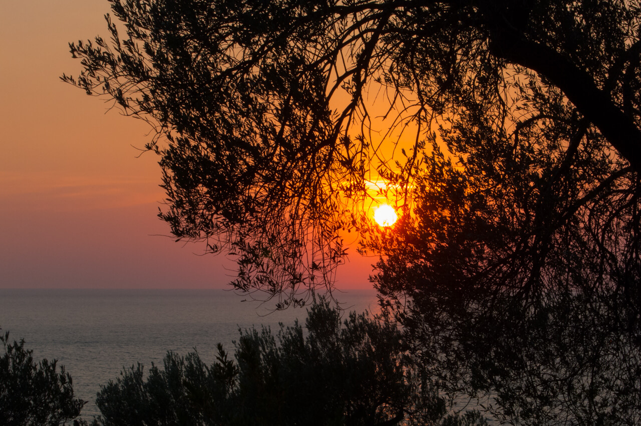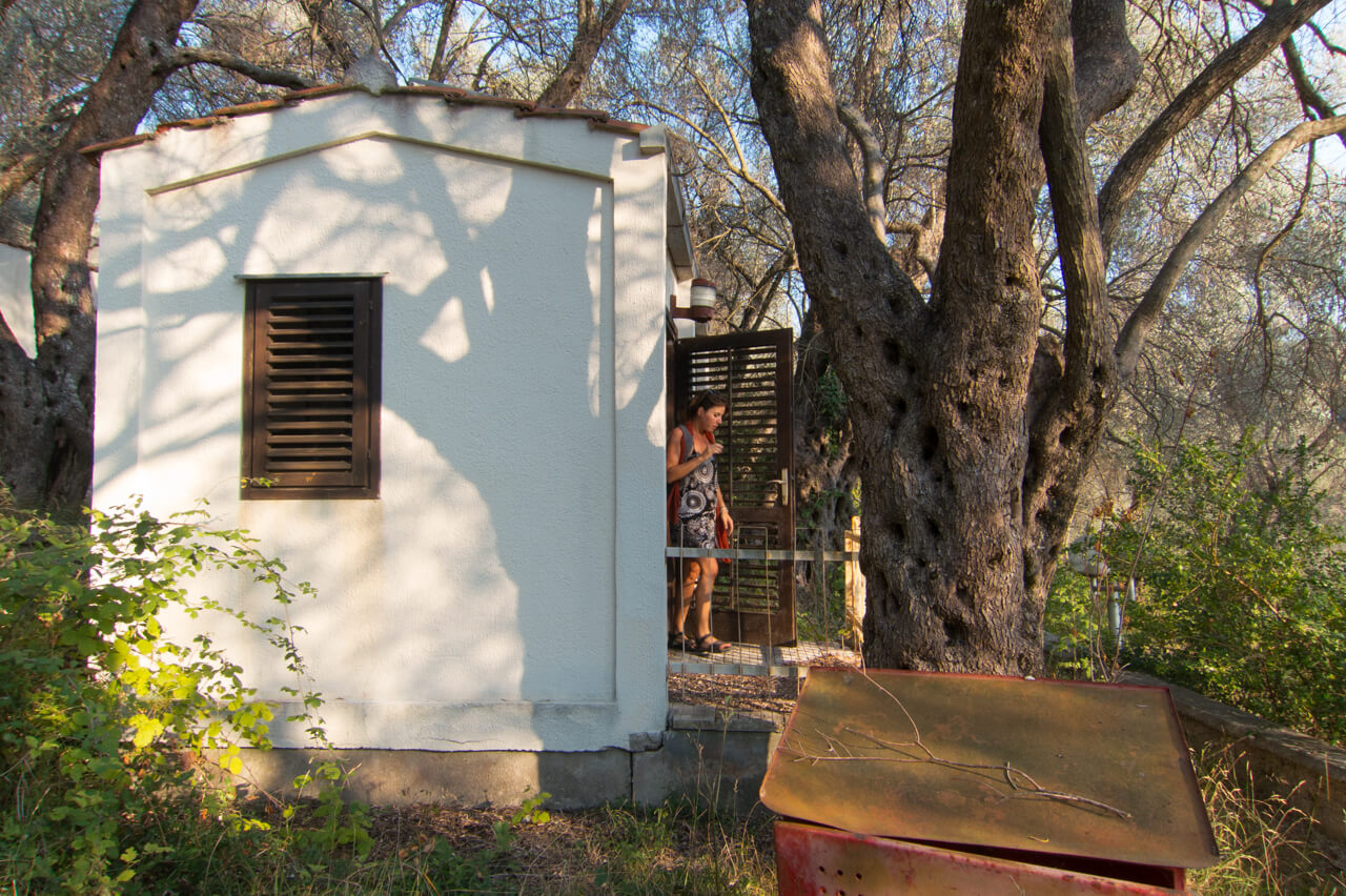 Hooked on the promise of a little discovery trip, we ducked under a barrier (they are only for cars, right?) and not much later saw some cabins hiding behind the olive trees.